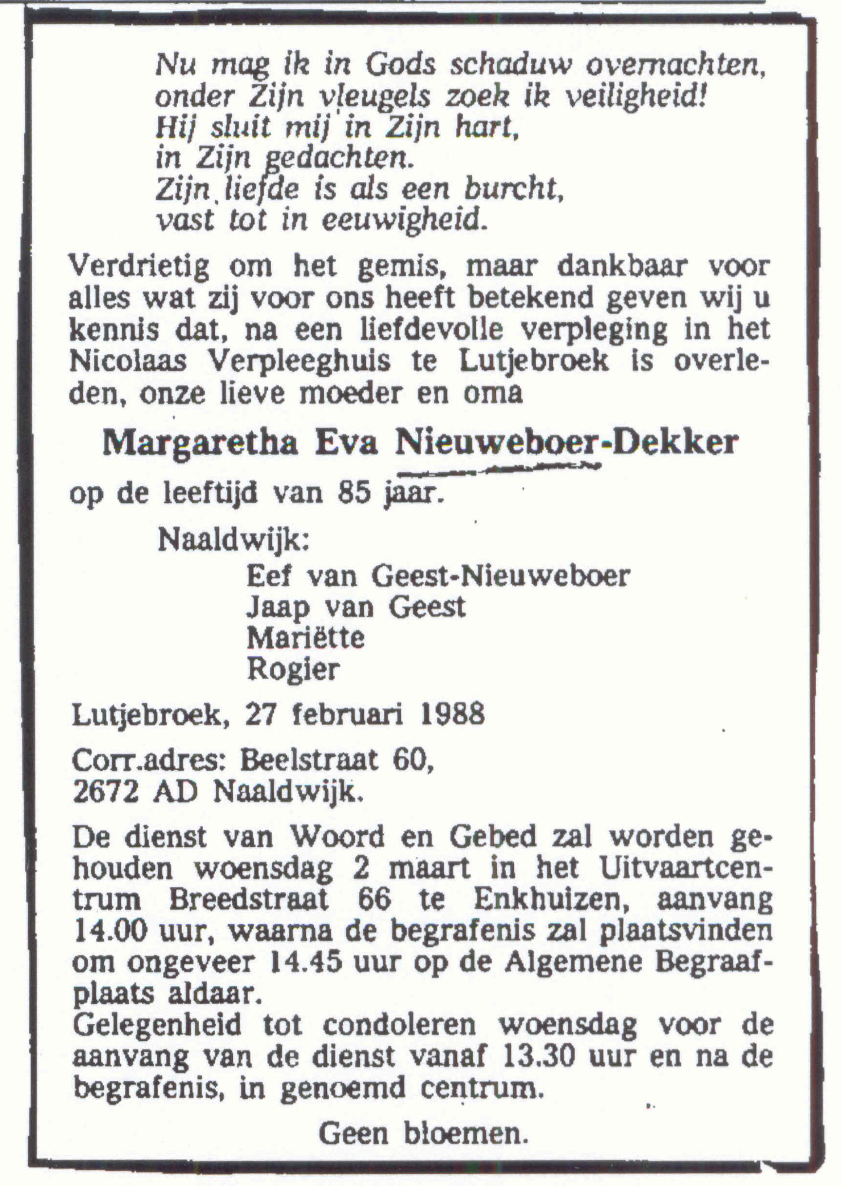 Overleden: 27-02-1988 te Lutjebroek Begraven 02-03-1988 te Enkhuizen