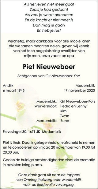 Overleden: 17-11-2020 te Medemblik Gecremeerd >20-11-2020