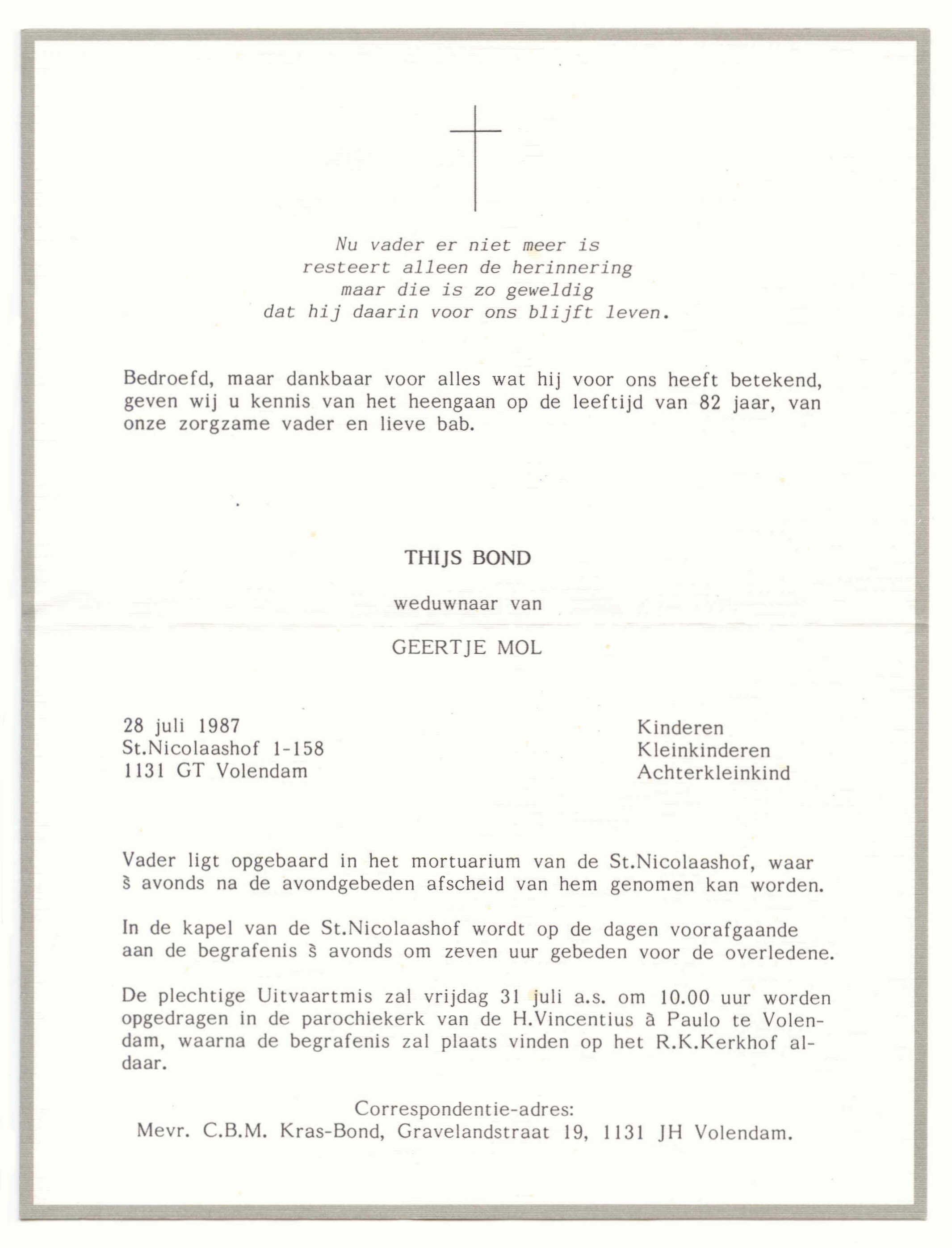 Overleden: 28-07-1987 te Volendam Begraven 31-07-1987 te Volendam